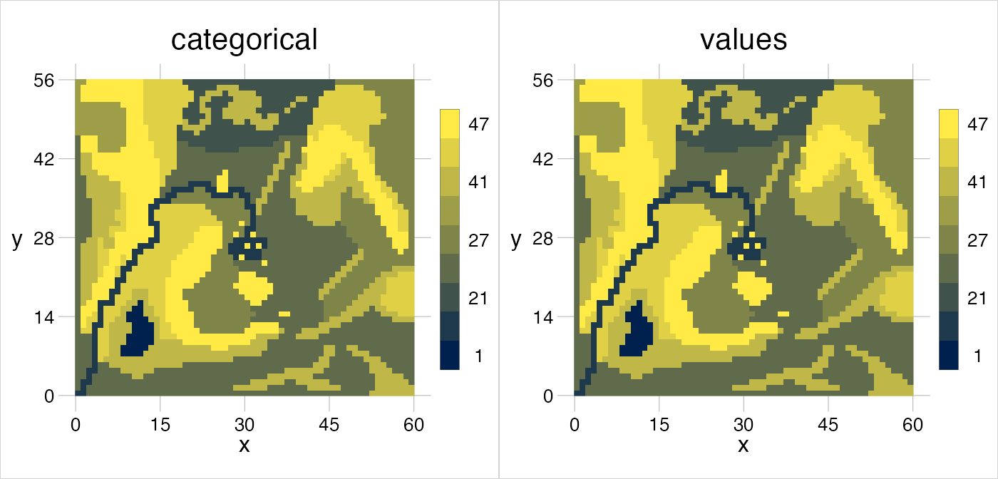 Colour palettes can be set by providing “waypoints” between which colours should be interpolated (see the documentation of colorRamp). By default, these are a darkish blue (#00204D) for low values and yellow (#FFEA46) for high values. When including additional values, or when building totally new palettes, the colour can be modified accordingly.